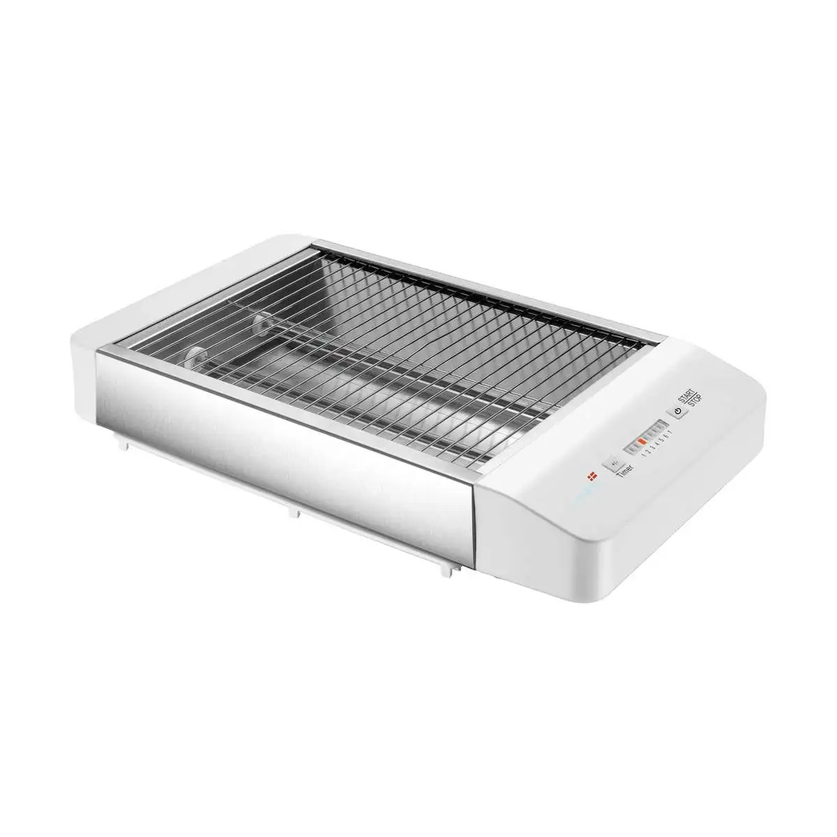 Den flade brødrister har plads til 4 almindelige skiver brød. Den har desuden elektronisk timer, så bollerne ikke brænder på.