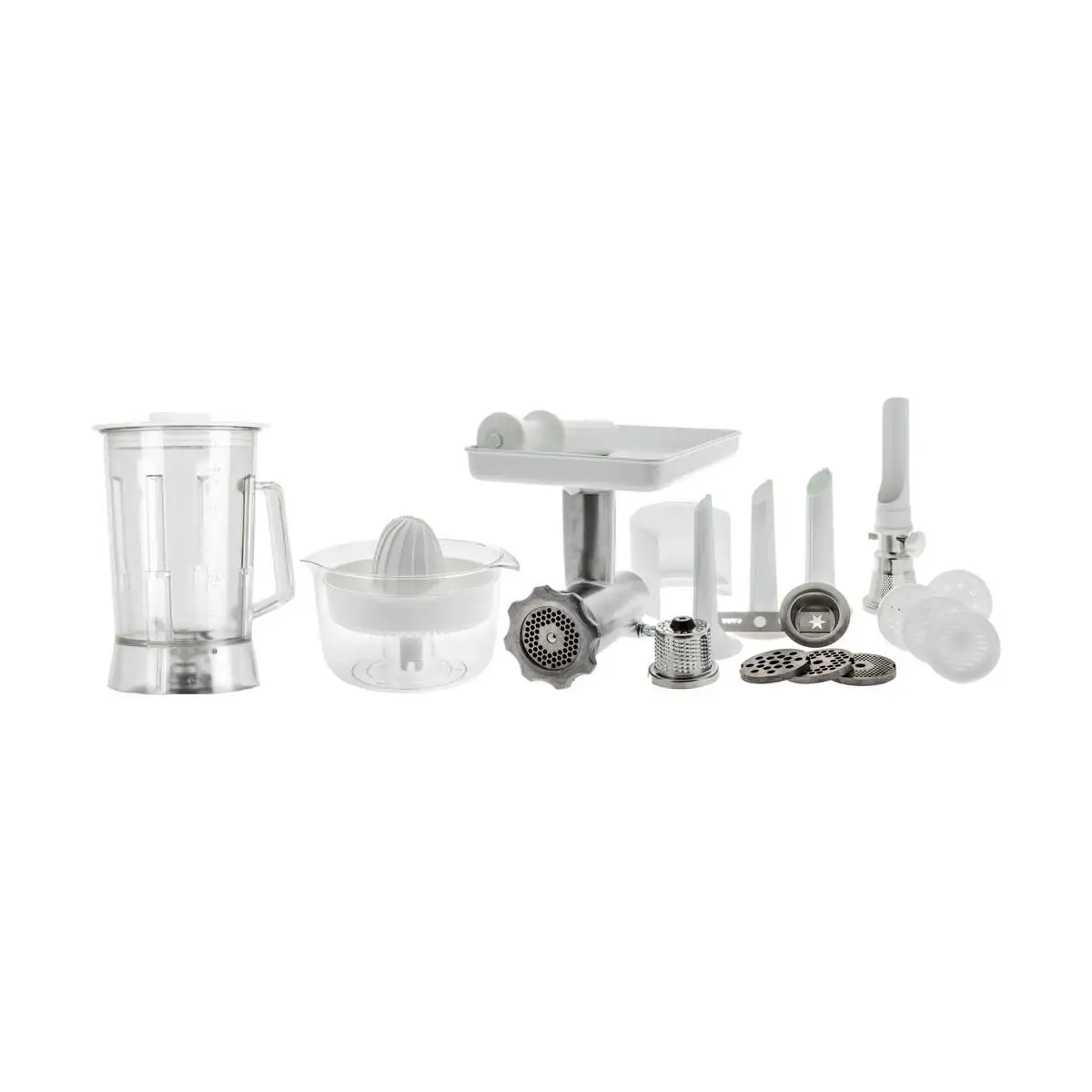 Pakken indeholder: blender, citruspresser samt kødhakkeren med alle tilgængelige dele: 4 hulskiver, pølsehorn, purépresser, pastaplader, nøddekværn og småkagejern.