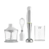 Der medfølger et piskeris, minihakker på 350 ml og et blenderbæger, som du blot klikker på blenderstaven – så er du hurtig rustet til de mange blende- og hakkeopgaver.
