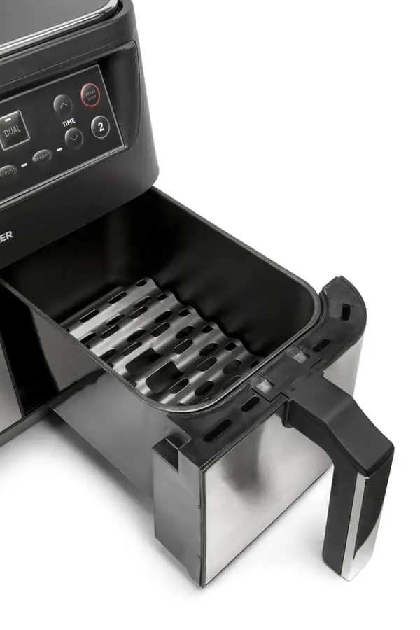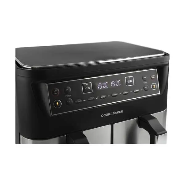 Mulighederne er mange med denne smarte airfryer fra Cook & Baker. Airfryeren har to skuffer, hvilket gør du kan tilberede to forskellige retter på samme tid og med to forskellige temperaturer. Den kan varme med 40-240 grader i op til 240 minutter.