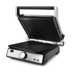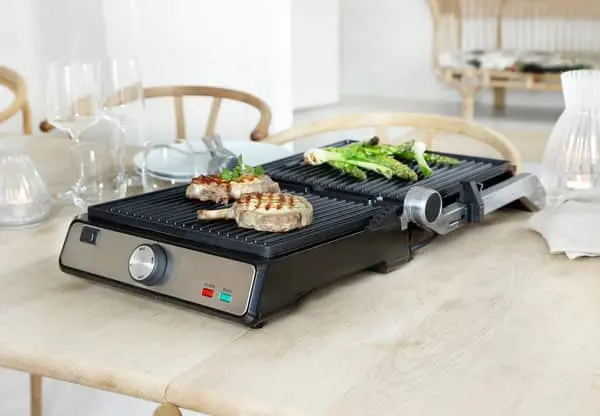 Stil kontaktgrillen direkte på middagsbordet og få en hyggelig aften ud af at lade gæsterne selv være med til at tilberede middagen. Kontaktgrillen har en stor stegeflade og kan åbnes helt ved hjælp af hængslet på 180 grader.