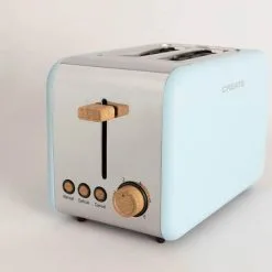 Opgrader dit køkken med denne retro brødrister fra Create! Med 2 brede skiver kan du nemt varme dine yndlingsbrød og boller. Den er ikke kun praktisk og nem at bruge, men dens retrostil skiller sig også ud og tilføjer et elegant touch til dit køkken.