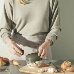 Fyld den lille beholder med løg, og træk i snoren, så hakker den løget ud i små fine stykker. Jo hårdere du trækker, jo finere bliver der snittet. Ud over et grønne aftryk, er en af fordelene også at du nemt kan holde øje med hvor groft eller fint du hakker.