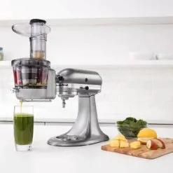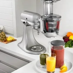 Uanset sæson, så smager hjemmelavet juice og saft helt fantastisk. Kast dig selv og familien ud i et eventyr af friskpresset appelsinjuice eller en hjemmelavet tomatsovs med en KitchenAid Artisan saftpresser. Saftpresseren monteres direkte på din KitchenAid og “tygger” sig langsomt igennem dine udvalgte ingredienser. Saftpresseren både skærer og presser dine grøntsager og frugter, så du får gavn af alle vitaminer og næringsstoffer. Saftpresseren har 3 forskellige filtre, der giver dig mange forskellige muligheder, alt efter hvor meget frugtkød du vil have i din frugtsaft. Alle løsdele tåler opvaskemaskine. KitchenAid giver dig 2 års garanti på saftpresseren. Model: KSM1JA.