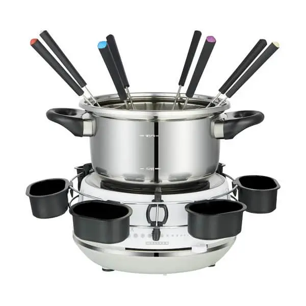 Tilbered kød, rejer og grøntsager eller brug fonduegryden til dessert med ost eller chokolade. Med til gryden følger 8 fonduegafler og 6 sauceskåle, så hele familien kan være med.
