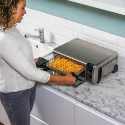 Ninja 8-i-1 Flip multifunktionsovnen giver dig en nem madlavning samtidig med, at den giver dig pladsen tilbage i køkkenet. Ovnen har en stor kapacitet og kan trods sit kompakte design f.eks. enten indeholde en stor pizza eller 1 kg pommes frites. Det unikke design gør, at du kan vippe ovnen på højkant og nemt stille den væk for kompakt opbevaring – det er perfekt, hvis bordpladsen i forvejen er knap.
