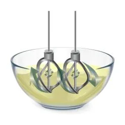 Der medfølger 1 par helix piskere, så du kan blande ingredienserne hurtigere og mere jævnt, samt 1 par forkromede dejkroge og 1 piskeris til fx flødeskum, stiftpiskede æggehvider, saucer og desserter.