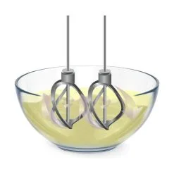 Der medfølger 1 par helix piskere, så du kan blande ingredienserne hurtigere og mere jævnt, samt 1 par forkromede dejkroge og 1 piskeris til fx flødeskum, stiftpiskede æggehvider, saucer og desserter.