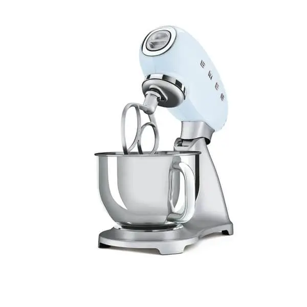 Retro køkkenmaskine i formpresset aluminium fra SMEG i en smuk pastelblå farve. Med denne køkkenmaskine er du dækket ind i forhold til de udfordringer, du møder i køkkenet i hverdagen eller når der skal eksperimenteres med lækre opskrifter til weekendens gæster.